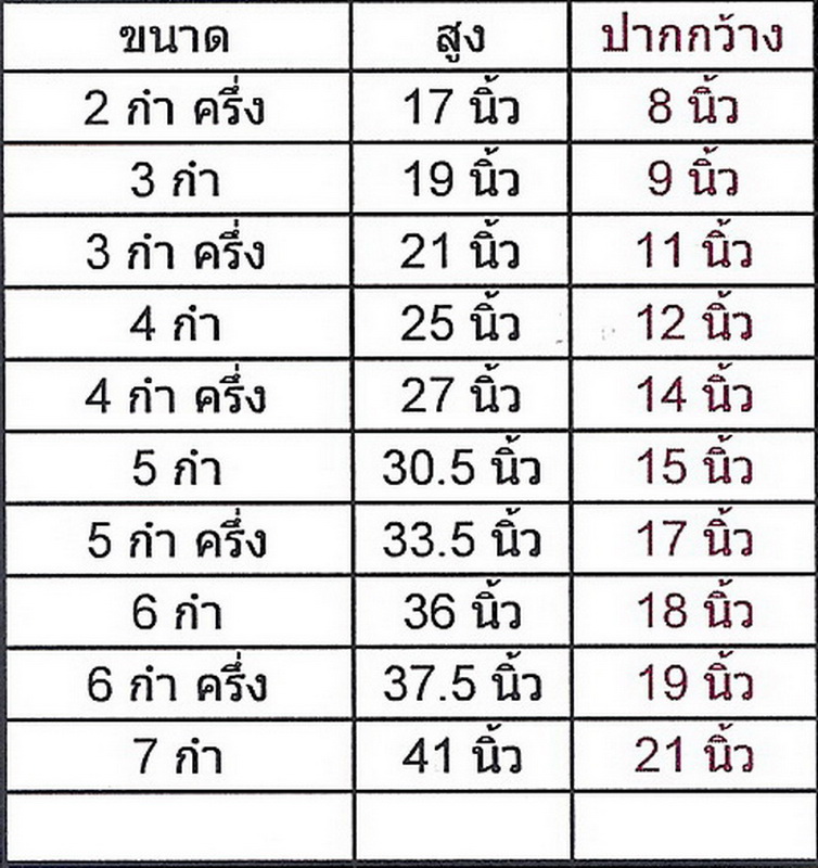 ตารางขนาด ของระฆังทองเหลือง และ ระฆังลงหิน