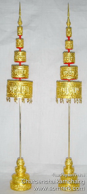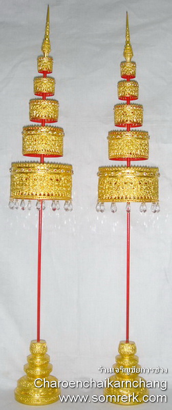 รูปที่ 10 ฉัตรตั้ง ทองเหลือง ตีลาย ปิดทองคำ 100% วงล่าง 1.5 นิ้ว สูง 32 ซม่ วงล่าง 2 นิ้ว สูง 41 ซม วงล่าง 3.5 นิ้ว สูง 64 ซม