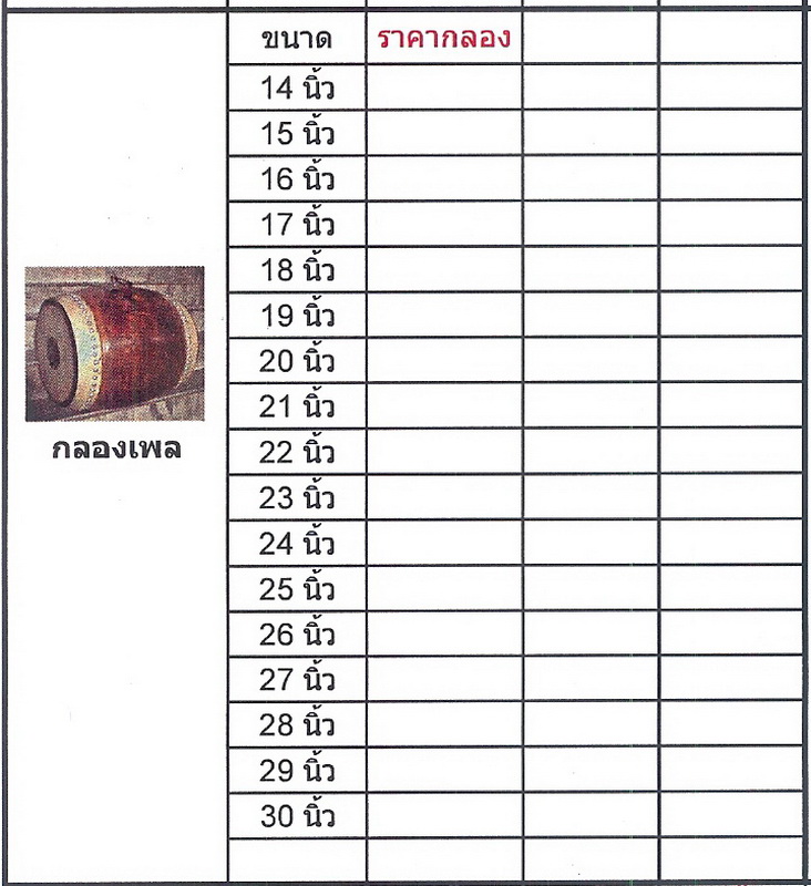 กลองยาว มีขนาดหน้ากว้างกลอง 8 นิ้ว 9 นิ้ว 10 นิ้ว 11 นิ้ว 12 นิ้ว