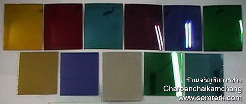 รูปที่ 1 กระจกสี มีทั้ง แบบโค้ง และ แบบแบน แบบ แบน ยี่ห้อ 8N แบบ โค้ง แบบแบน มี สีขาว สีเหลืองทอง สีน้ำทะเล สีน้ำเงิน สีเขียว แบบโค้ง สีแดง สีเหลืองทอง สีน้ำทะเล สีน้ำเงิน สีเขียว
