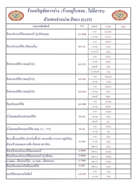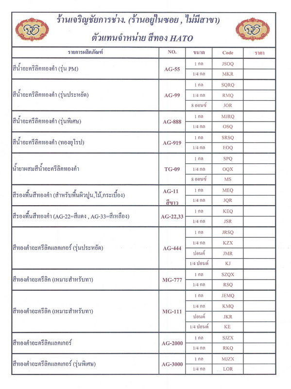 Table List of Hato Paint