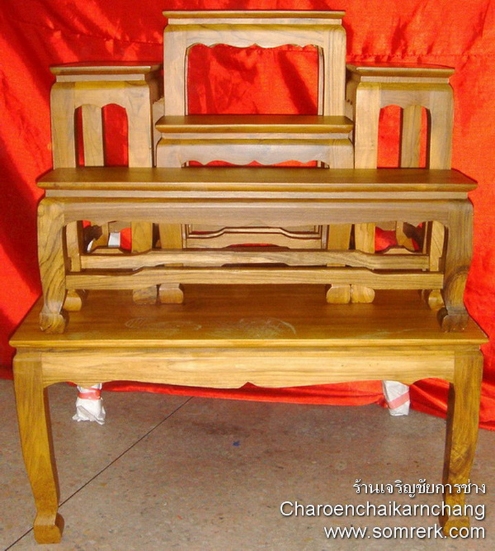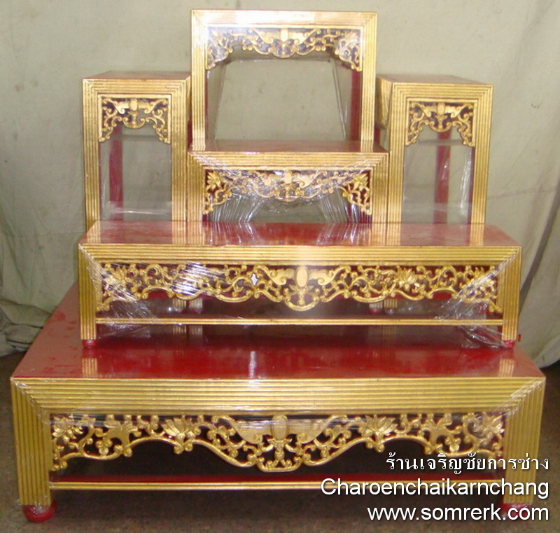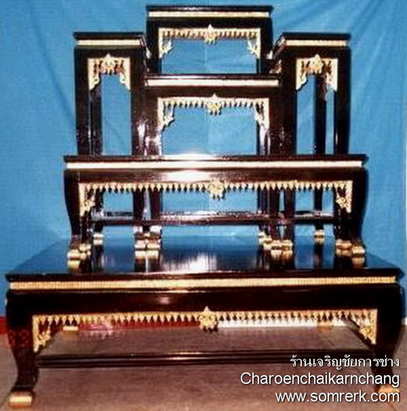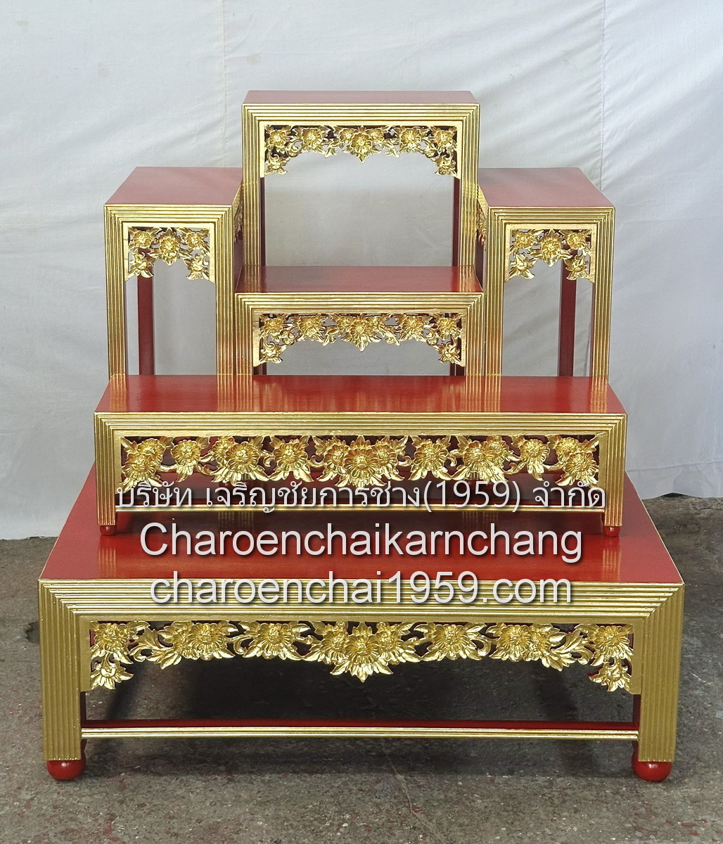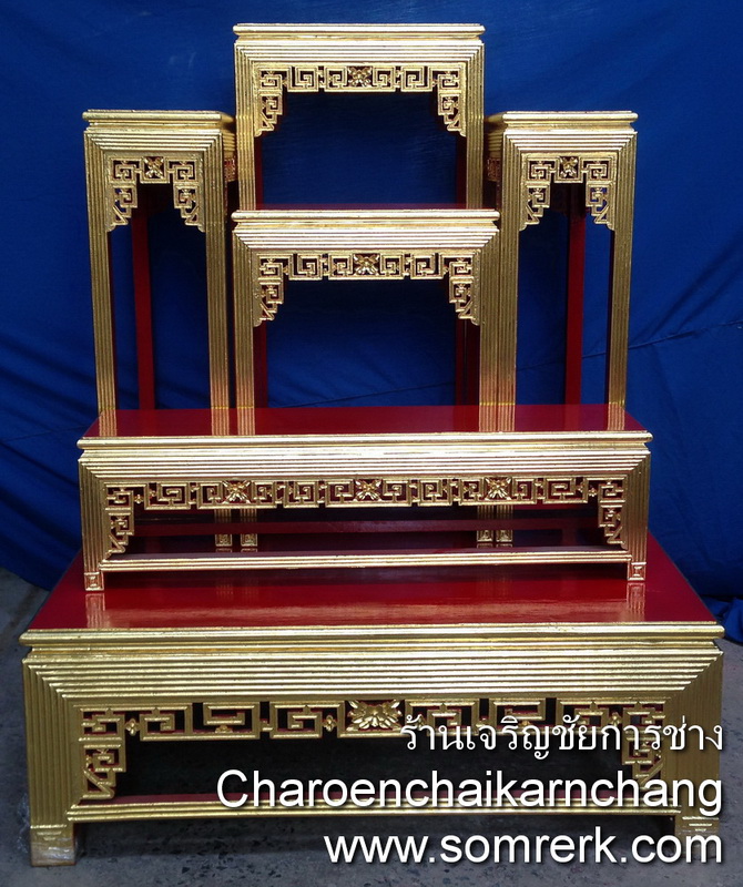 แบบที่ 4 โต๊ะหมู่ 5 ไม้สัก ขาหวาย ลายค้างคาว ปิดทอง100% ร่องแดง ครณ. หน้า 8" / หน้า 10"