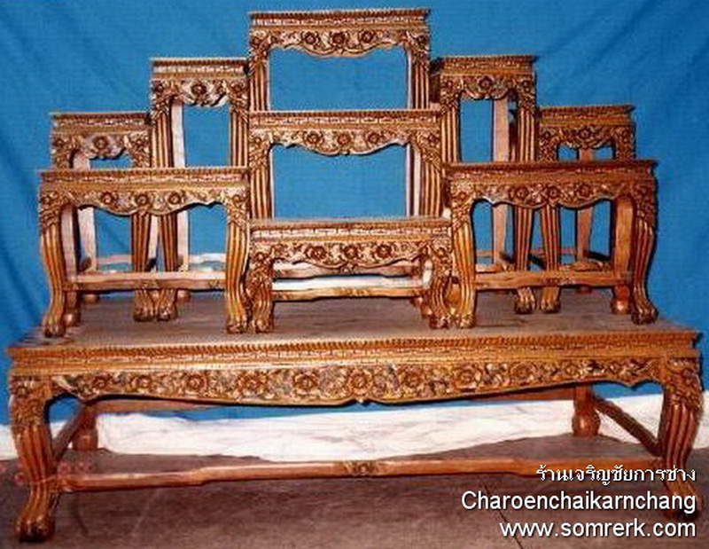 แบบที่ 8 YON1N8M9TA โต๊ะหมู่ หน้า 8 หมู่ 9 ไม้สัก ขาสิงห์ แกะลาย ขัดสีเนื้อไม้ ปิดทองเคตามลาย ยน2.จช.