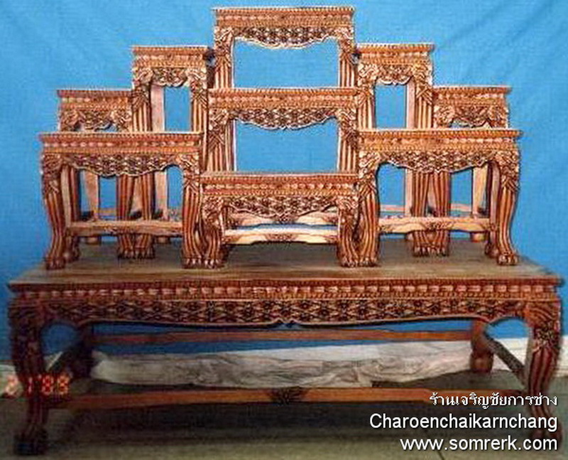 แบบที่ 14 โต๊ะหมู่ หน้า 10 หมู่ 9 ลายจีน ขาหวาย ไม้สัก ปิดทองคำ H 136 W 161 D 100 cm เตียงรองสูง 40 ซม
