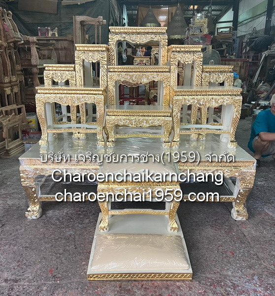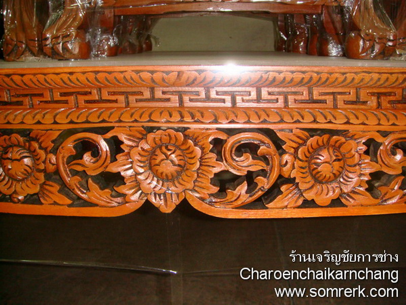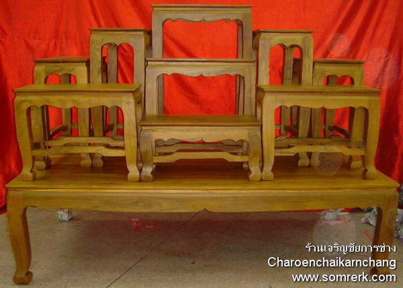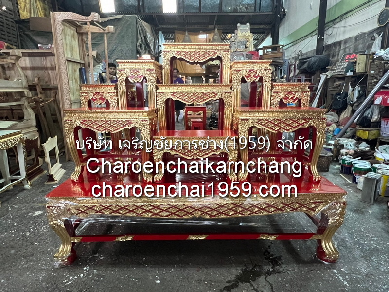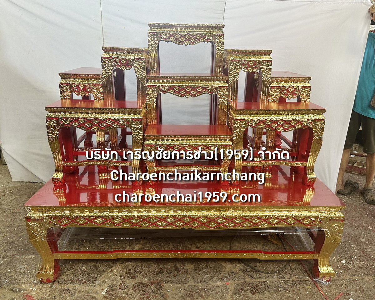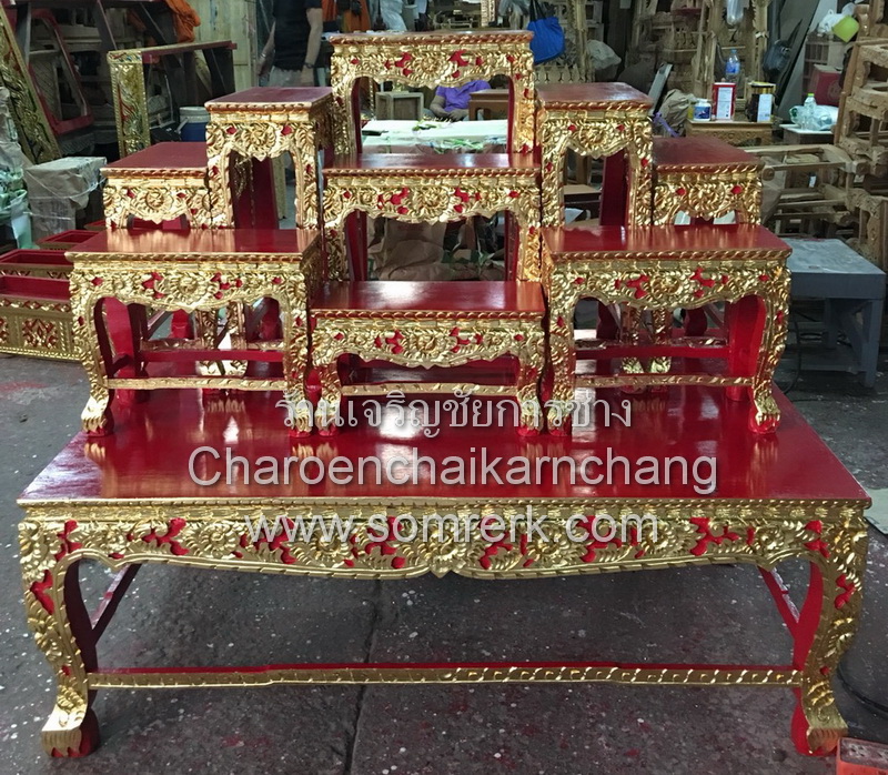 แบบที่ 3 WOODXXXC66 โต๊ะหมู่ หน้า 10 หมู่ 9 ไม้สัก แกะลายไทย ก้านขด ปิดทองเค ล่องสีแดง นก.จช.