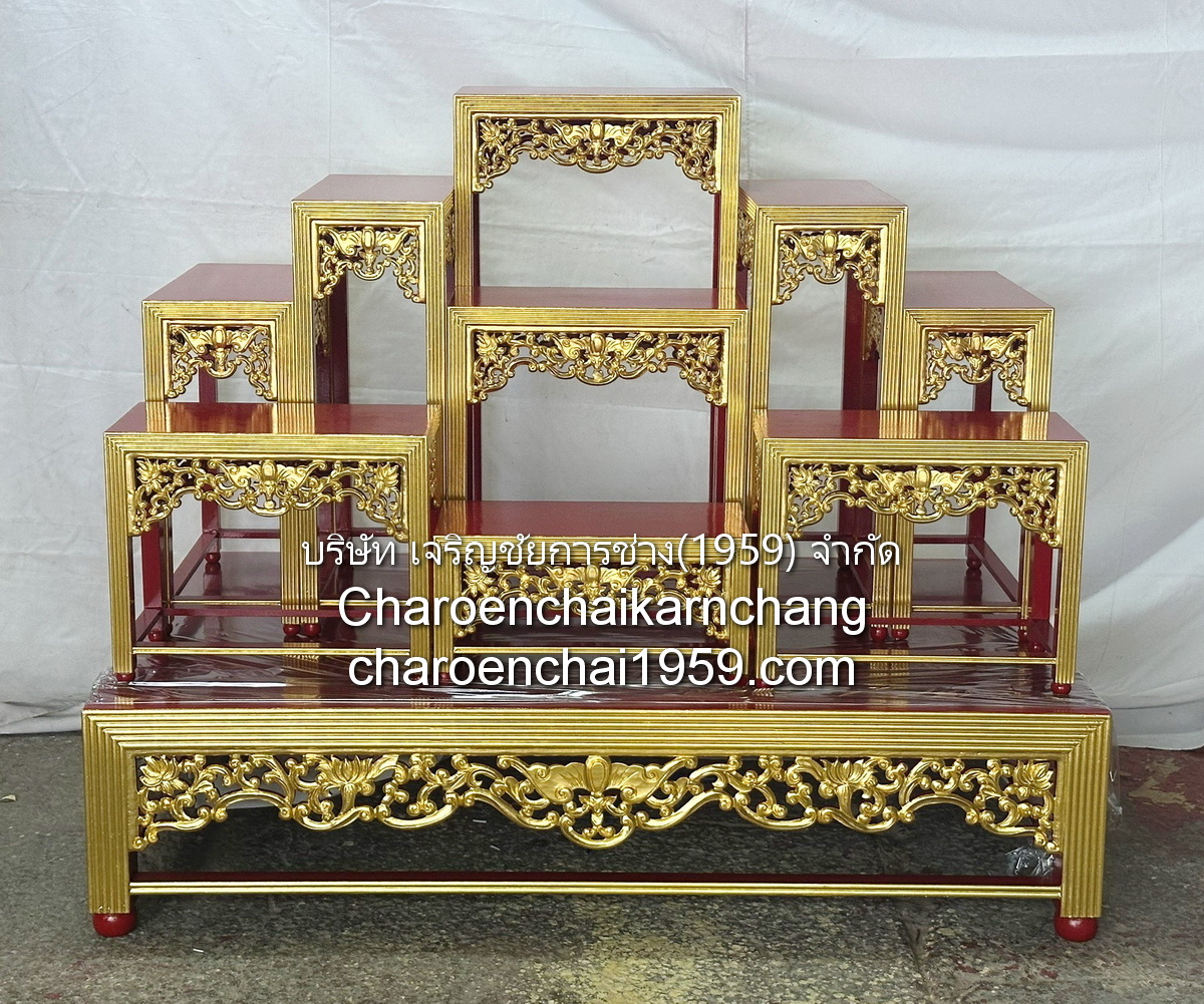 แบบที่ 5 โต๊ะหมู่ 9 ลายไทยเปลว ปิดทองเค ร่องแดง หน้า 8" - H 113 W 132 D 91 cm (เตียง 43 ซม) หน้า 9" - H 114 W 148 D 94 cm (เตียง 44 ซม) หน้า 10" - H 135 W 168 D 101 cm (เตียง 44 ซม)