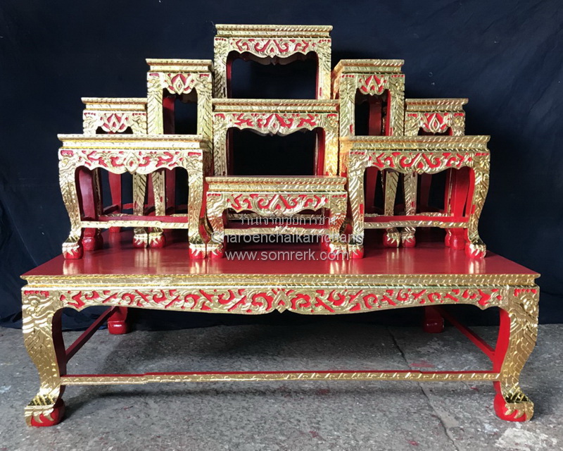 โต๊ะหมู่ 9 ลายไทย ก้านขด ปิดทองเค ร่องแดง หน้า 9" - H 114 W 147 D 93 cm (เตียง 44 ซม) หน้า 10" - H 135 W 165 D 105 cm (เตียง 46 ซม)