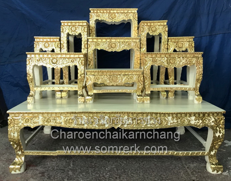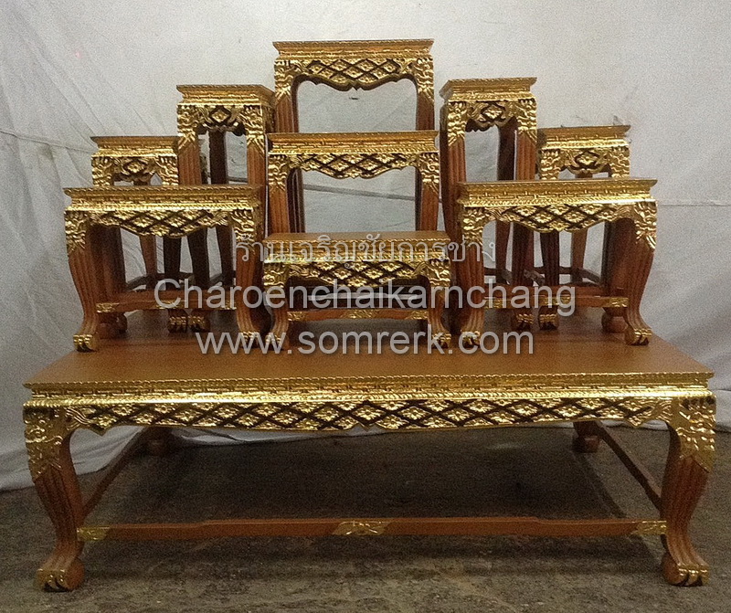 MYTHAL1009 โต๊ะหมู่ หน้า 10 หมู่ 9 ไม้ธรรมดา ขาสิงห์ ลายเหนือ ปิดทองเค สีโอ๊ค มท. Code18BXJKQZXCV