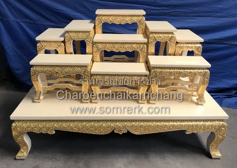 แบบที่ 4 PREW10HGTA + PREW1009TA โต๊ะหมู่ หน้า 10 หมู่ 9 ไม้ธรรมดา ลายไทยก้านขด ปิดทองเค สีครีม + โต๊ะกราบ เปลว.