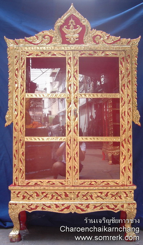 แบบที่ 1 ตู้พระไตรปิฎก 45 เล่ม 3 ชั้น ไม้ธรรดา ปิดทองเค ล่องสีแดง สูง 176 กว้าง 97 ลึก 34 ซม