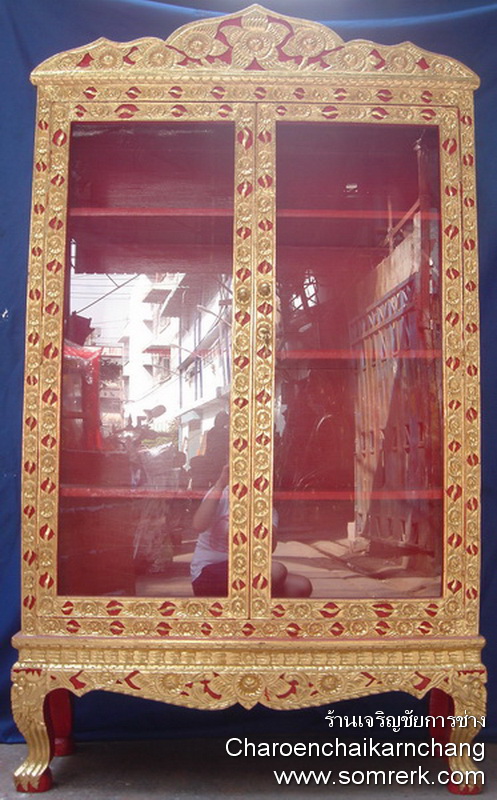 แบบที่ 1 ตู้พระไตรปิฏก 4 ชั้น ไม้ธรรมดา แกะลาย ปิดทองเค ล่องสีแดง Code12SellTXPRZXDX