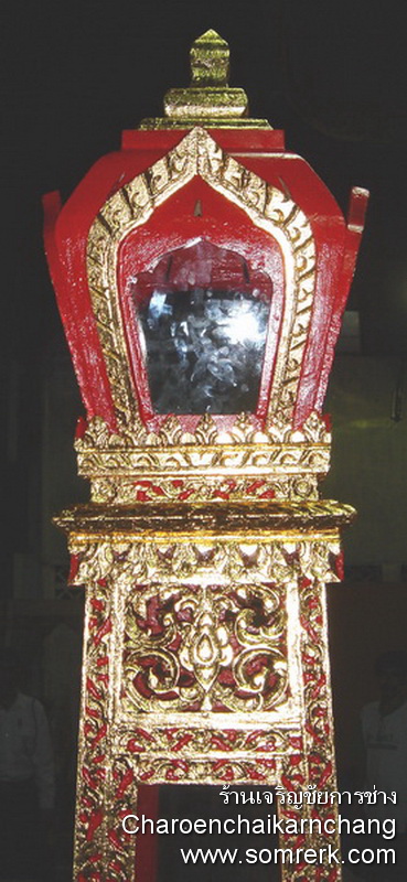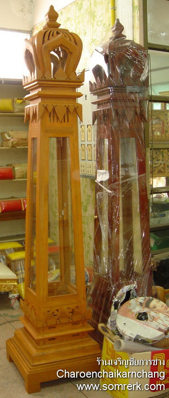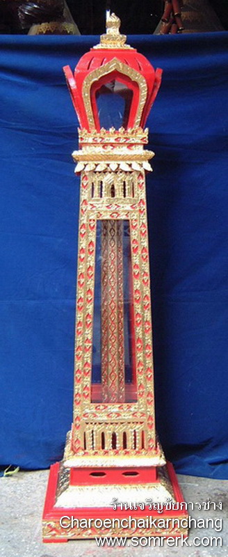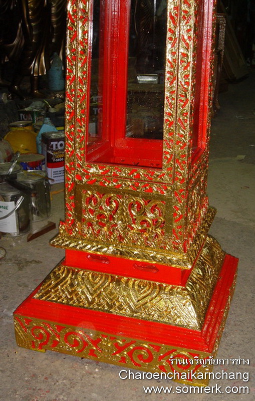 แบบที่ 1 ตู้เทียนชัย มีทั้ง ไม้ธรรมดา และ ไม้สัก แกะลาย ปิดทองเค ล่องสีแดง ขนาด สูง 254 ซม ฐานล่างสุด กว้าง 56 ซม ลึก 56 ซม